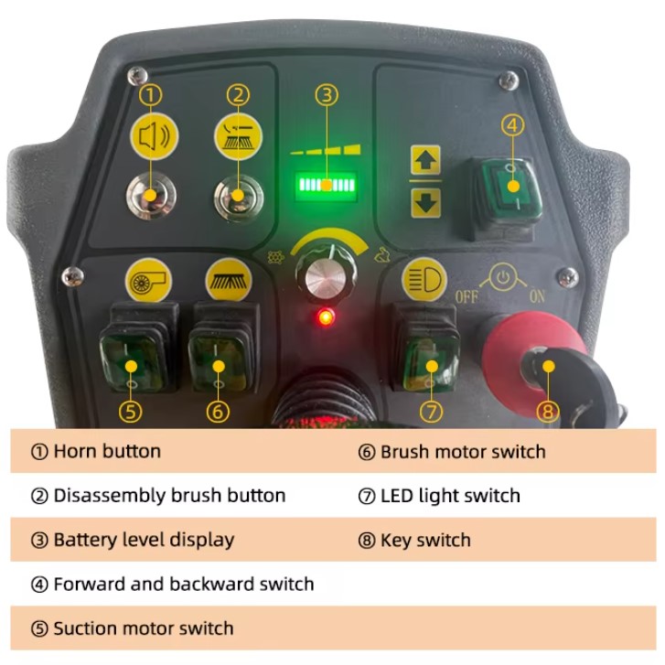 Le panneau de commande de l’autolaveuse sol professionnel SMITH J115, visible sur l’image, est conçu pour une utilisation intuitive. Voici le détail des éléments :