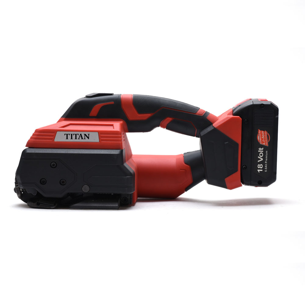 Cercleuse électrique de qualité supérieure pour les sangles en plastique PP et PET TITAN avec affichage numérique à cristaux liquides LED peut être utilisé pour cercler des paquets, des palettes, de l’acier, du bois, de la brique, de la fibre, etc. La cercleuse électrique TITAN est entièrement automatique, mais elle est également possible de le faire fonctionner en mode semi-automatique ou manuel. La cercleuse électrique TITAN ne pèse que 4 kg et ses dimensions sont de 330 * 150 * 140 mm. Elle peut être utilisée avec des feuillards en plastique PET et PP d’une largeur de 10 à 16 mm et d’une épaisseur de 0,5 à 1,2 mm. Elle peut effectuer des cerclages verticaux et horizontaux. La cercleuse électrique TITAN utilise la technologie de cerclage la plus récente, basée sur la soudure par friction, qui garantit que les bandes de plastique sont fortement collées entre elles. La force de tension peut être ajustée de 400 à 3800N. La force maximale est suffisante pour cercler des palettes, du bois, de l’acier ou d’autres objets lourds. Avec la cercleuse électrique TITAN , vous recevez une batterie rechargeable d’une capacité de 4000mAH. Avec une charge, qui prend environ 90 minutes, la cercleuse électrique TITAN peut effectuer jusqu’à 700 cerclages. Avec une cercleuse électrique, vous accélérez le processus d’emballage, réduisez le coût d’emballage de plus de 15 % et améliorez l’intensité de la combinaison d’environ 2 fois. De plus, comme vous n’aurez pas besoin de boucles métalliques pour l’emballage, vous améliorerez le processus d’emballage et réduirez les coûts du matériel d’emballage. La cercleuse électrique est dotée d’un dispositif d’alarme pour la faible puissance et d’un signal lumineux lorsque le cerclage est terminé. Elle fonctionne normalement sous un grand nombre de poussières, de minuscules fibres et d’autres environnements abominables, avec un filtre anti-poussière exceptionnel. TITAN est léger et peut être utilisé d’une seule main. Cette cercleuse électrique est également conçue pour fournir un joint de soudure par friction de haute qualité.  Avec la cercleuse électrique TITAN, vous recevrez une batterie puissante, un chargeur et une boîte pratique pour transporter l’outil de banderolage. Elle est garantie 12 mois et le service est disponible dans l’Union européenne.
