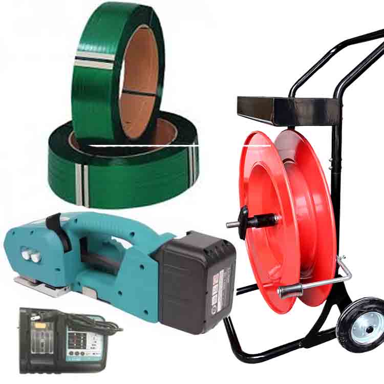 Kit cerclage feuillard NEO 9-16mm PET/PP avec batterie et chargeur + feuillard PET 15,5mm – chariot de cerclage