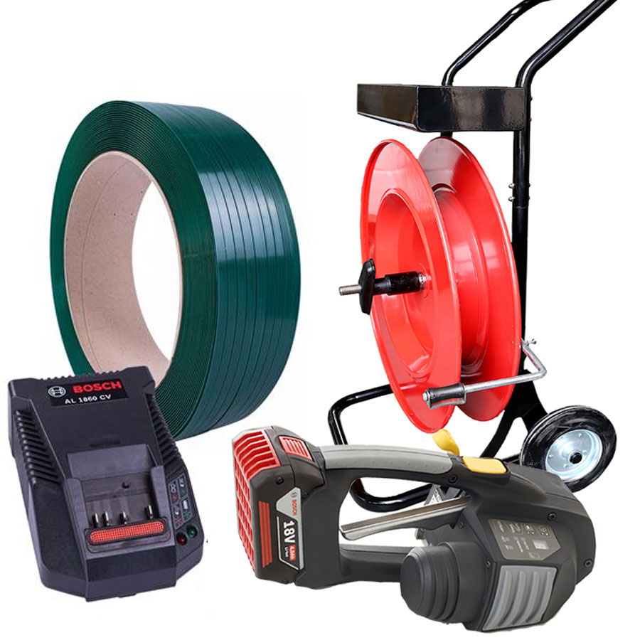 Nous avons préparé un kit de cerclage de batterie qui comprend un outil de cerclage de batterie TES 12-16mm avec deux batteries et un chargeur + une bande en PET de votre choix et un chariot distributeur pour la bande en PP/PET. Veuillez sélectionner une des largeurs de feuillard PET suivantes ci-dessus :