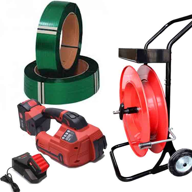 Kit de cerclage feuillard TITAN 10-16 mm PET/PP avec batterie et chargeur + feuillard PET 12 mm – chariot de cerclage