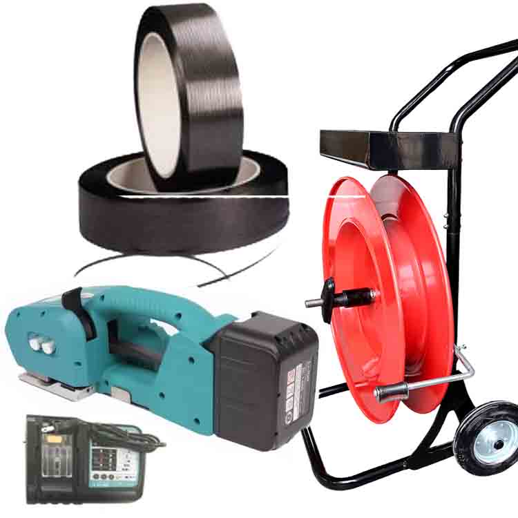 Outils de cerclage NEO 9-16mm PET/PP batterie et chargeur inclus + feuillard PP 15,5mm – chariot de cerclage